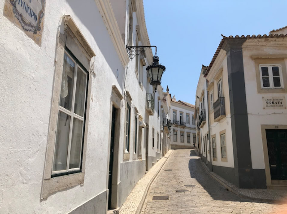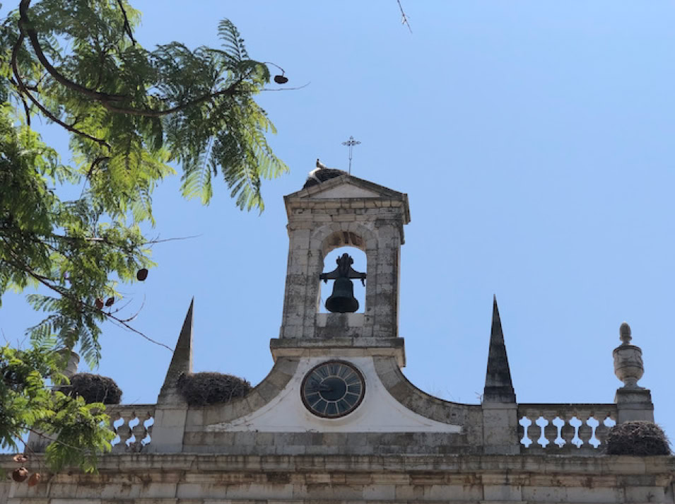 Es geht mit der Fähre nach Olhão, dann zum Bahnhof. Da stehen wir nun und schauen auf den Fahrplan. Dieser wurde für heute geändert und bis zur nächsten Abfahrt ist über eine Stunde Zeit. Kurzentschlossen fahren wir mit Uber weiter. Bevor es in die Altstadt geht, laufen wir durch einen imposanten Torbogen der Stadtmauer und selbst auf dem befindet sich ein Storchennest wie auf allen Türmen und Masten in der Algarve. Die Altstadt Faros verzaubert uns mit ihren Gassen und ihrem charmanten Flair.