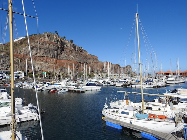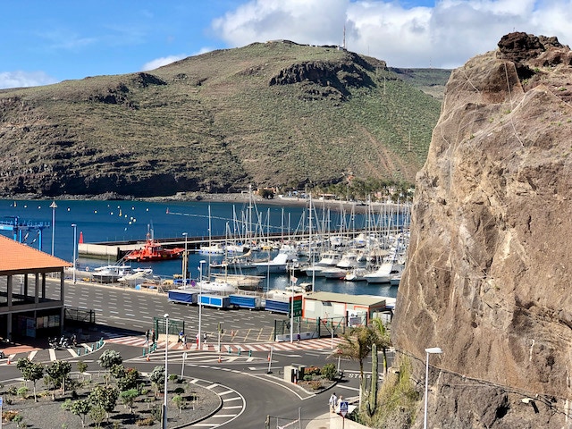 La Gomera, die zweitkleinste Insel der Kanaren hat wieder ein anderes Gesicht als ihre Schwestern. Neben dem Hafen erhebt sich ein rotbrauner Fels und bildet den ruhigen Hintergrund zu den vielen sanft schaukelnden Booten.