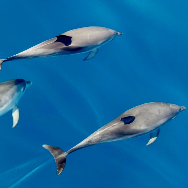 Irgendwann muss der Motor dann doch etwas unterstützen, um nicht auf der Stelle zu schaukeln. Schon bald begleiten uns nacheinander zwei Delfinschulen, welche sich emsig im Wasser tummeln und in der Bugwelle schwimmen. Zur Krönung kommen uns parallel noch Pilotwale entgegen und ziehen an uns vorbei. Wow! Was für ein Erlebnis!