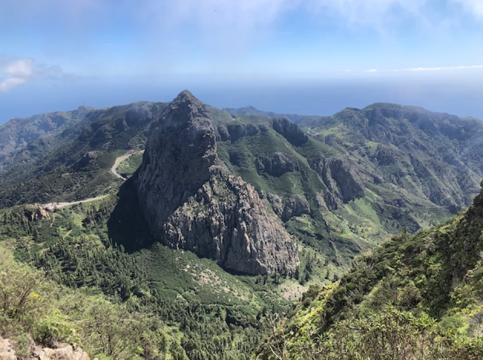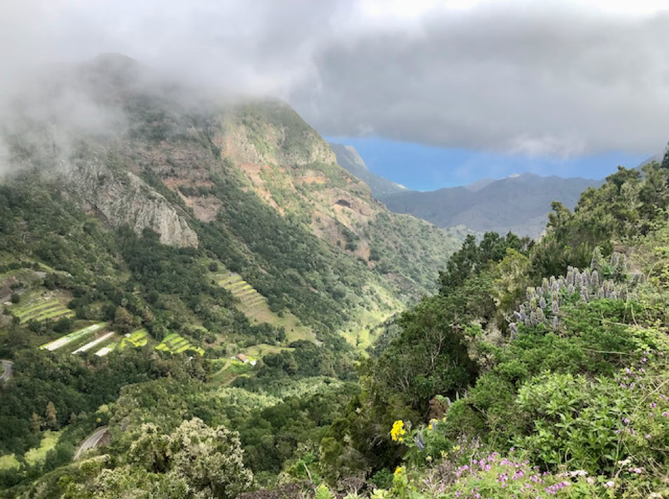 Beeindruckend ist der Nationalpark Garajonay. Wir fahren und laufen durch die mystischen Nebelwälder. An den Zweigen und Stämmen der Bäume wachsen Moose, welche wie Feenhaare im Wind wehen und die Feuchtigkeit der Luft aufnehmen. Blumen in leuchtendem gelb, blau und violett wachsen am Wegesrand und säumen die Berghänge bis in die Täler. Dazwischen markante Felsformationen.
